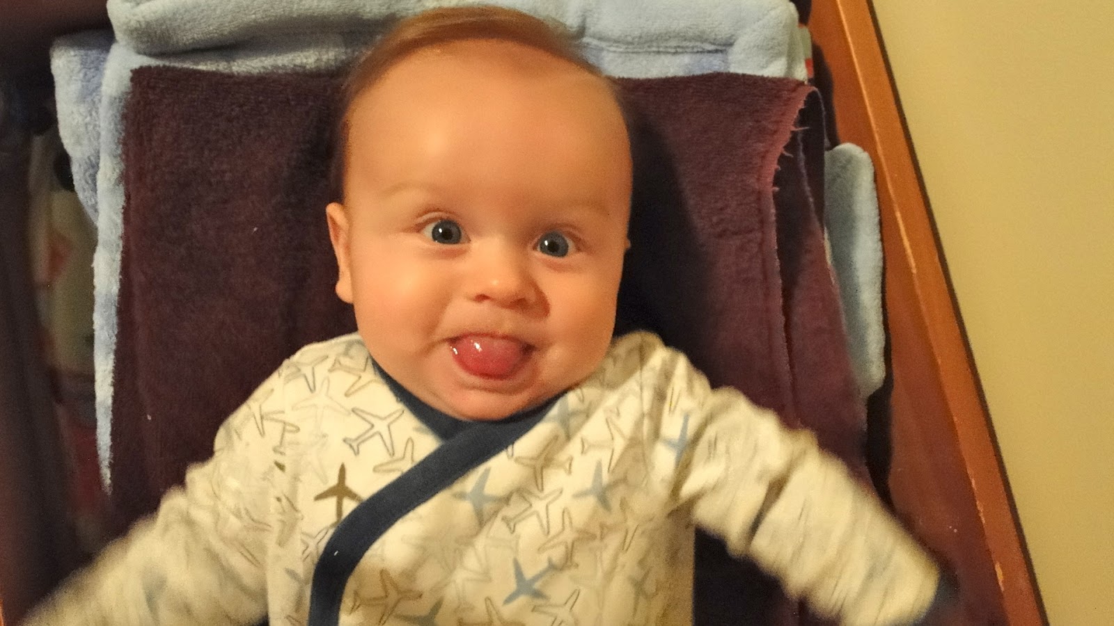 He is a smiley boy as long as he is not hungry or tired. But he also has some pretty funny face expressions-I guess thats been basically from birth though.