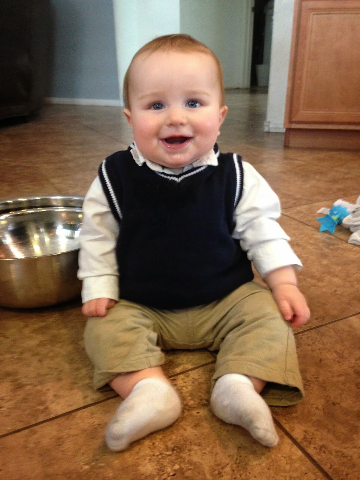 Well like I've mentioned this last month didn't go by as fast as most..but it does feel weird when I tell people Gavin is already 8 months old. This last month Gavin basically had a runny nose the whole time but mostly because of him cutting teeth. He cut his first tooth being one of the front bottom ones then he caught a cold then cut the other bottom tooth and I think had a couple days break and then the runny nose started up again and the top front tooth popped through. His gums were pretty swollen so I knew they were coming. He's working on the other top one right now! It's funny how they start coming out and then the next day be back in again (I don't know if other babies do that) Both my kids get clear runny noses when a tooth is about to come out and a low grade fever usually as well. So this last month had been a little rough for him-he hasn't been too bad just a little more fussy and needy. Some days worse than others but you can tell he's in some pain. Which leads to not sleeping well. So him going from sleeping from about 7:30-6:00ish then waking up a couple times a night was a little rough on us.